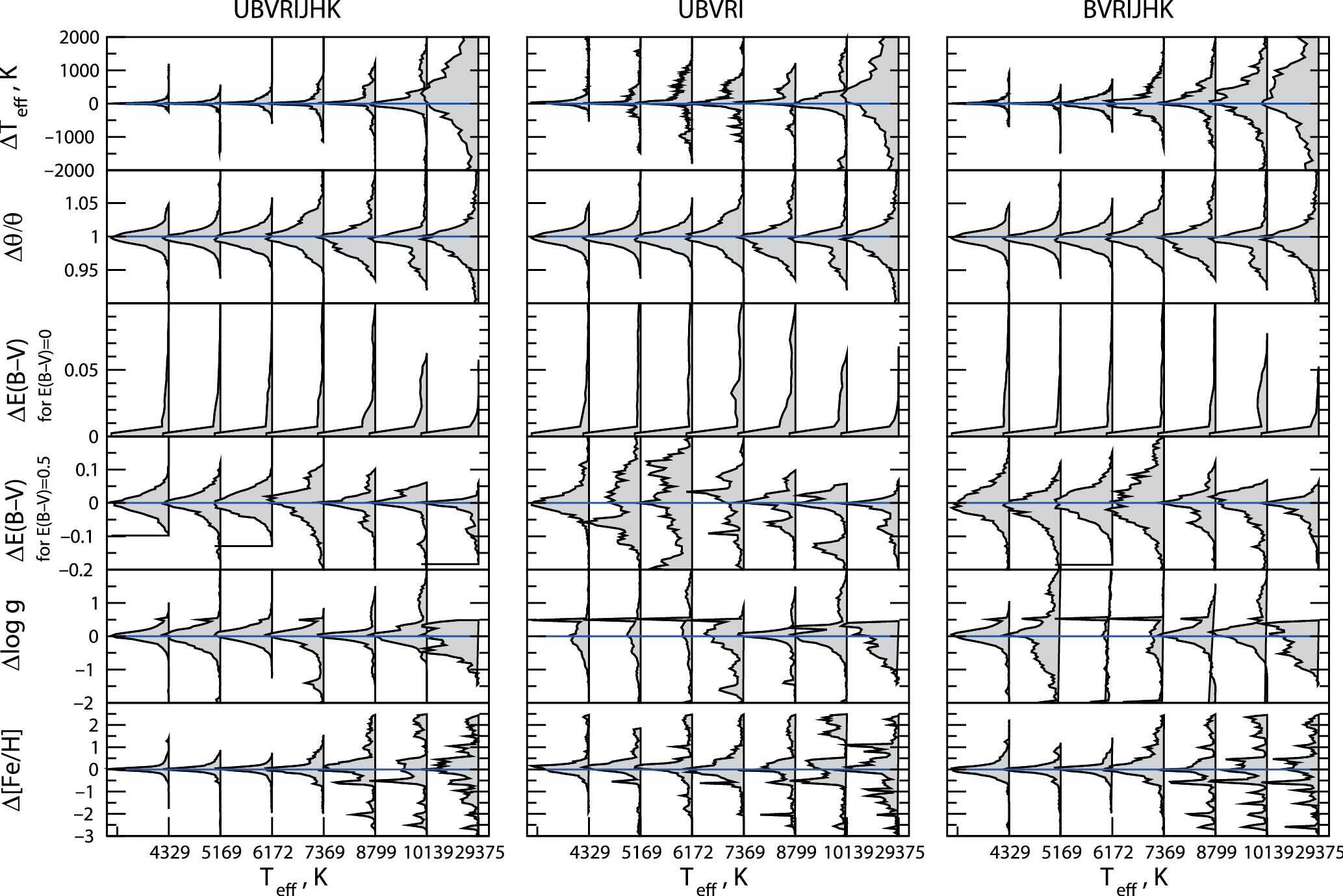 Распределения отклонений полученных параметров для разных температур. В первом столбце представлены данные с использованием полос UBVRIJHK, во втором – UBVRI, в последнем – BVRIJHK. Для избытка цвета показаны два варианта: для значений E(B–V) = 0 и E(B–V) = 0.5. Пик на ∆log g ≈ 0.5 соответствует граничному значению log g = 5.0