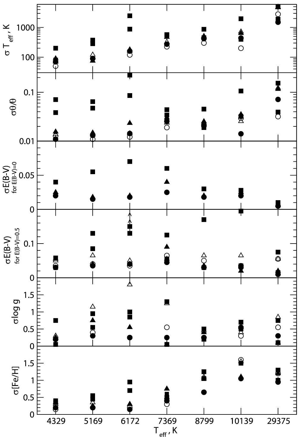 Рис. 5. Зависимости ошибок параметров от эффективной температуры звезды. Открытые символы – левая часть распределения относительно максимума, заполненные – правая часть. Случай UBVRIJHK отмечен кружками, UBVRI – квадратами и BVRIJHK – треугольниками.