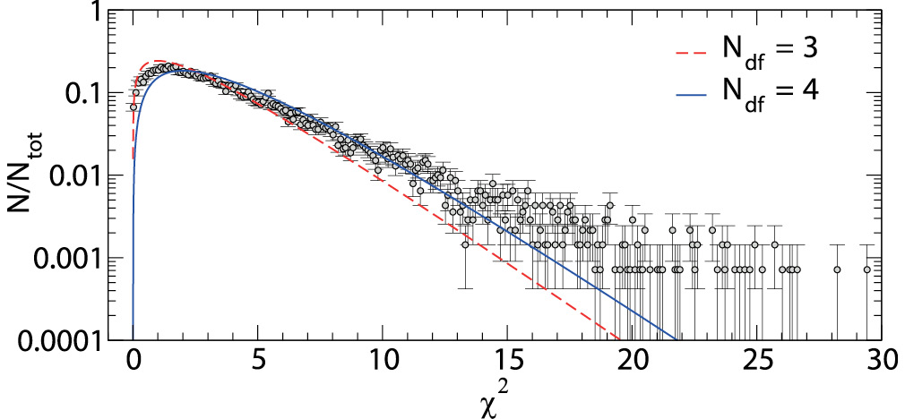 Рис. 6 демонстрирует статистическое качество расчетов – распределение значений χ2 по сравнению с теоретическими кривыми для значений степени свободы (Ndf), равными 3 и 4. При χ2 ≤ 7 распределение проходит между этими значениями, а затем следует Ndf = 4. В нашем случае количество степеней свободы равно 3 (семь показателей цвета минус четыре параметра). Однако параметры не являются независимыми, существует сильная корреляция между Teff и E(B–V) (см. рис. 1). Поэтому и число степеней свободы может приближаться к 4. Среднее значение среднеквадратичной ошибки составило менее 0.01m (рис. 3). Таким образом, мы делаем вывод о хорошем статистическом качестве работы алгоритма поиска глобального минимума.