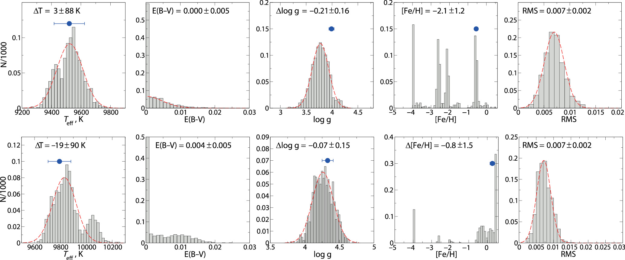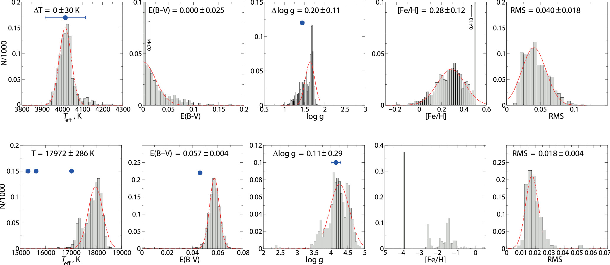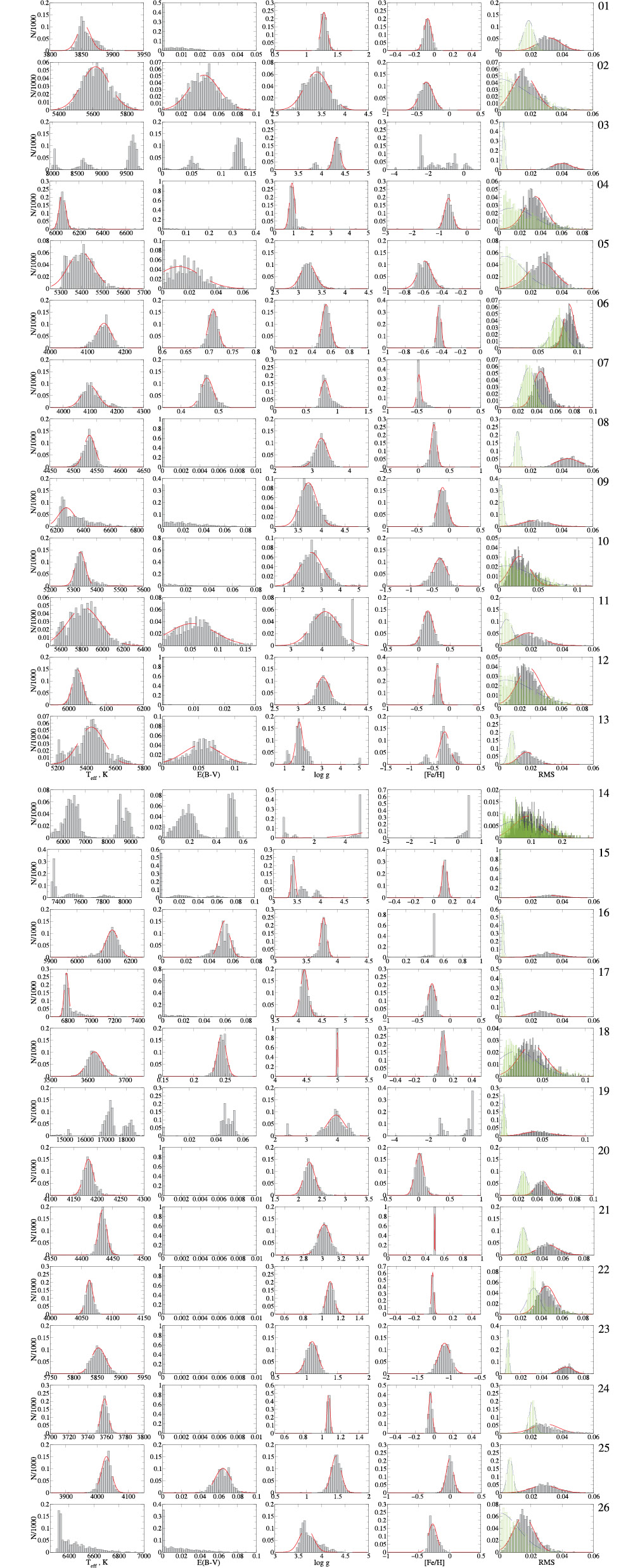Рис. 3. Распределения восстановленных параметров, полученные разработанным методом минимизации для точки N2 (69 K). Синтетические звездные величины зашумлены ошибками 0.005m для UBVRI и 0.02m для JHK. Вверху каждой строки указано название модели в формате Teff / E(B–V) / log g / [Fe/H]. Среднее значение и дисперсия отображены в ячейке для каждого параметра. Приближение асимметричной функцией Гаусса отмечено красной пунктирной линией. На правых графиках серым цветом показано распределение среднеквадратичных ошибок, рассчитанных только для полос UBVRI. Распределения для всех точек тестирования доступны в дополнительных материалах.