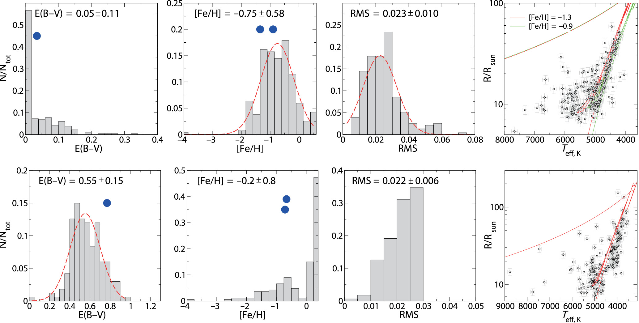 2.4.1. NGC5904 = M. Для тестирования метода было выбрано 235 звезд шарового скопления M5. Результаты представлены в верхней части рис. 9. Это шаровое скопление расположено на галактической широте +47° на расстоянии ~7 кпк с небольшим межзвездным покраснением E(B–V) = 0.035 ± 0.010m (Лэйден и др., 2005). В работе (Кирби и др., 2018) опубликованы значения металличности 19 звезд, принадлежащих скоплению, среднее значение [Fe/H] = –1.35 ± 0.05. Возраст NGC5904 составляет 10.6 ± 0.8 млрд лет и [Fe/H] = –0.9, согласно Вуди, Шлауфман (2021), оба значения отличаются от данных других авторов. Ванденберг и др. (2013) сообщают о возрасте 11.50 ± 0.25 млрд лет. Другие авторы опубликовали значения возраста (10.9 ± 1.1 (Саларис, Вейсс, 2002), (12.2 ± 1.3, Ан и др., 2009) и (12.25 ± 0.75, Доттер и др., 2010). Полученное нами среднее значение металличности [Fe/H] = –0.75 ± 0.58 соответствует спектроскопическим измерениям, однако дисперсия велика. Около 56% решений дают значение E(B–V) = 0, средняя величина по 1000 вариаций составила E(B–V) = 0.05 ± 0.11, что соответствует реальному значению. Для сравнения наших результатов на диаграмме Teff–R мы рассчитали радиусы звезд, исходя из полученных угловых диаметров и известного расстояния до скопления, и использовали эволюционные треки MESA (Чой и др., 2016) с возрастом 11.5 млрд лет и металличностью [Fe/H] = –0.9 и [Fe/H] = –1.3 (последний столбец рис. 9). Теоретические изохроны хорошо представляют ветвь красных гигантов (RGB). Для более горячих звезд нередко наблюдаются значительные отклонения от изохрон, вследствие больших RMS ошибок.