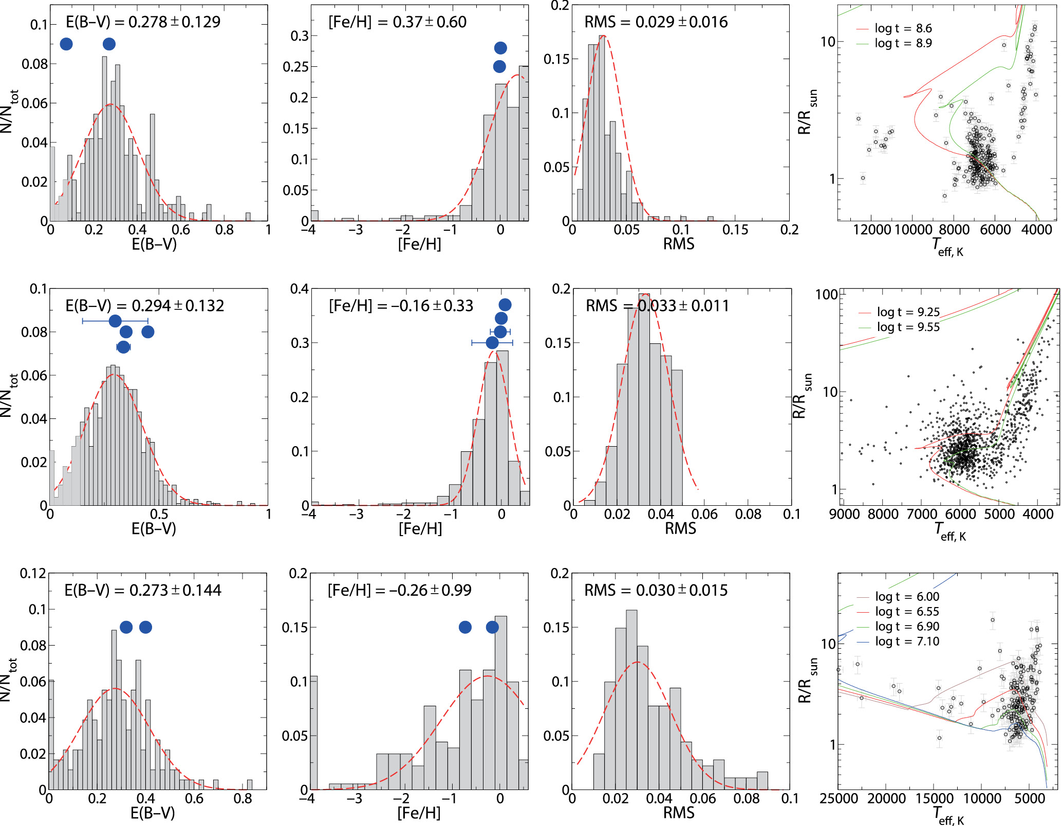 Рис. 10. Распределения избытка цвета E(B–V), металличности [Fe/H], среднеквадратичного отклонения и диаграммы Teff–R для звезд рассеянных скоплений NGC6866 (вверху), NCG 7142 (в центре) и IC1590 (внизу).