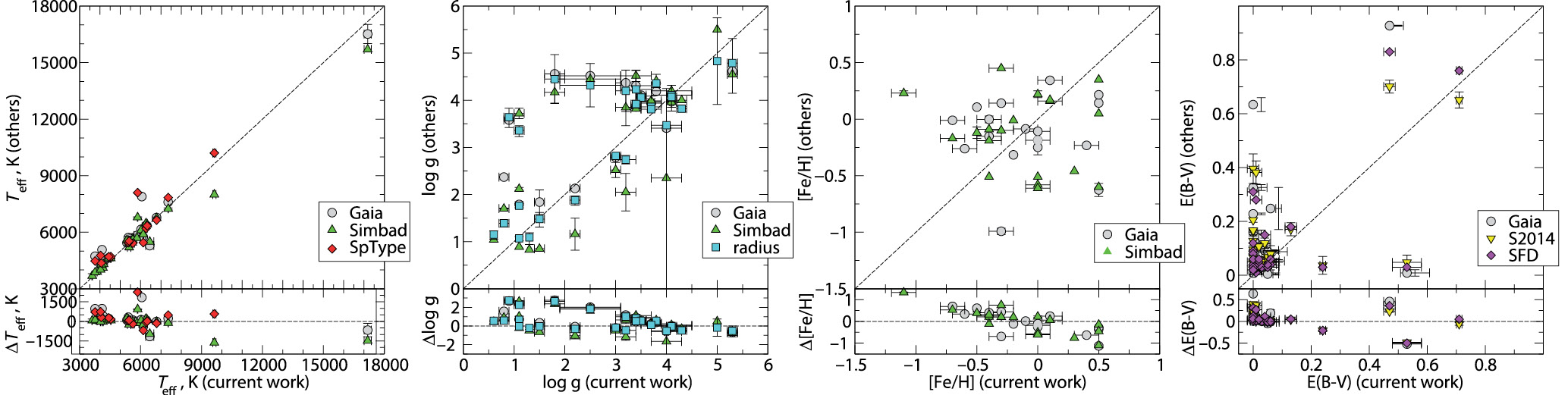 Все авторы применяют методы минимизации отклонений между наблюдаемыми и теоретическими звездными величинами в разных фильтрах. Точность современных фотометрических обзоров не позволяет получить этими методами однозначное решение (Teff, log g, [Fe/H], E(B–V)), поэтому привлекается дополнительная информация в виде эволюционных треков, изохрон, параллаксов Gaia, карт межзвездного поглощения, а также используется вероятностный подход для оценки параметров звезд. Байо и др. (2008) разработали сервис VOSA (virtual observatory SED analyzer), который по известным потокам или звездным величинам в разных диапазонах длин волн (сервис поддерживает практически все фильтры фотометрических обзоров) позволяет получить вероятностную оценку Teff, log g для маломассивных звезд со значениями log g от 3.5 до 4.5 и известным поглощением AV с использованием эволюционных треков и изохрон. В интерфейсе сервиса доступно изменение диапазона металличности применяемых сеток моделей SED. Проект STARHOUSE (Кейроз и др., 2018) привлекает данные ряда спектроскопических обзоров для оценки звездных масс, возрастов и межзвездного поглощения AV путем анализа распределения вероятности на сетке эволюционных моделей.