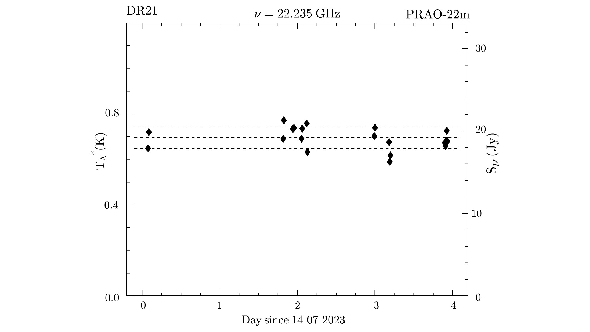 Рис. 1. Результат измерений в непрерывном спектре DR21 на частоте 22.231 ГГц. Значения TA* в полосе 12.5 МГц приведены за вычетом мазерной линии от DR21OH (см. пояснения в тексте). Пунктирными линиями показаны средневзвешенное значение и величины, отстоящие от среднего в обе стороны на стандартное отклонение единичного измерения. Шкала справа приведена в предположении, что спектральная мощность излучения DR21 на данной частоте равна 19.2 Ян.