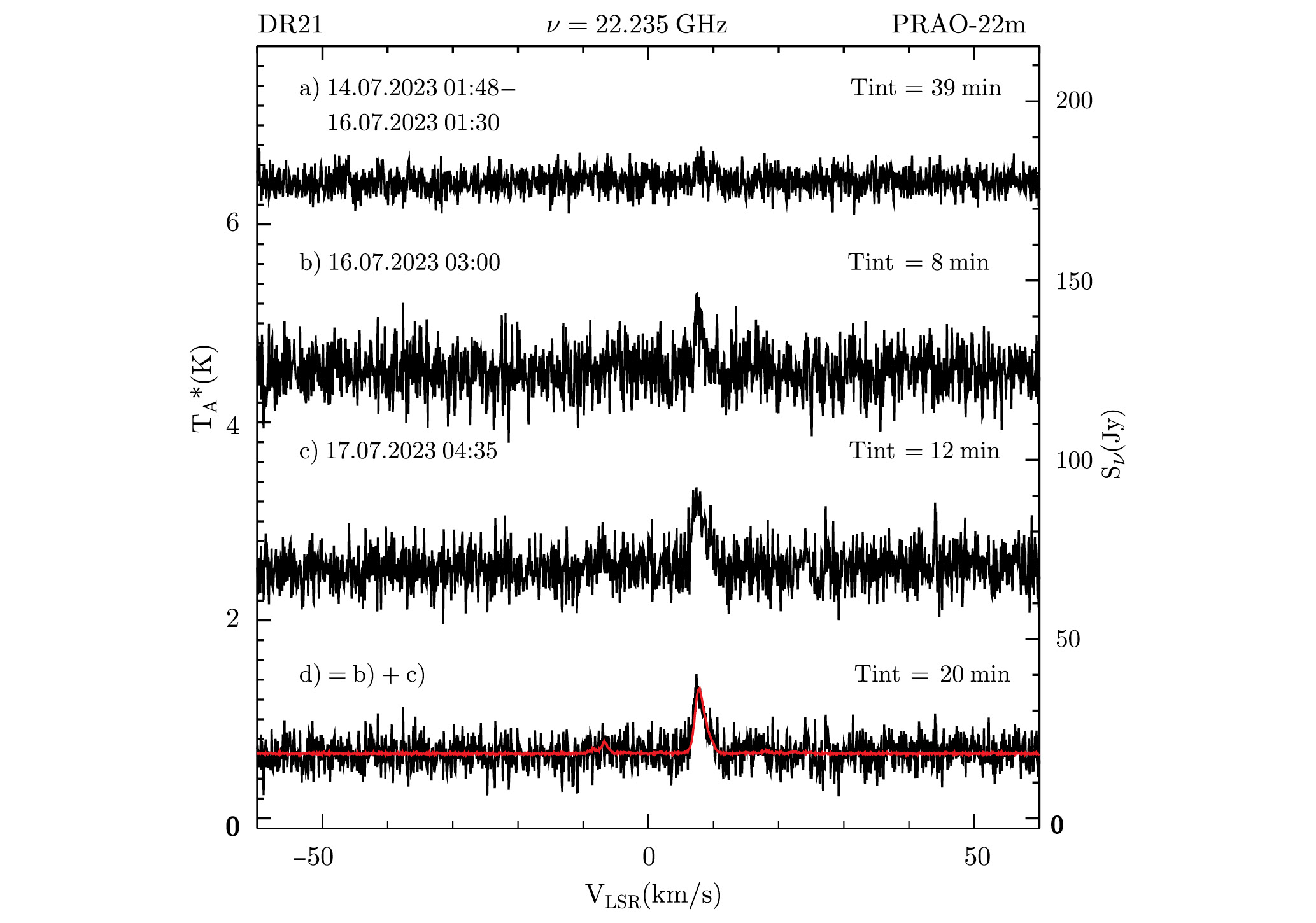 Поскольку измерения DR21 в спектральном режиме проводились нами неоднократно, начиная с 2019 г., для нас показалось необычным увидеть в июле 2023 г. на фоне континуума признаки линии (рис. 1), никогда не наблюдавшейся ранее. Хотя спектральная деталь оказалась максимально интенсивной 17 июля, анализ предыдущих записей показал, что слабые признаки ее присутствия стали появляться уже начиная с 14 июля. В частности, верхний спектр на рис. 1 показывает результат усреднений девяти ночных спектрограмм с 14 июля по начало ночи 16 июля, когда в каждой из записей линия достоверно была еще не видна. Типичное время накопления одной спектрограммы в режиме ON-ON составляло 4 мин. Все спектральные измерения, представленные в данной работе, проводились с разрешением 6.1 кГц по частоте, или 82.3 м/с по скорости. На рис. 1b, с приведены результаты измерений, когда присутствие линии уже не вызывало сомнений. Так как координаты DR21, использованные нами при наблюдениях, R.A.(2000) = 20h 39m 01s.2, Dec.(2000) = 42° 19ʹ 45ʺ, отличались на 184ʺ от известных координат мазера H2O в DR21OH R.A.(2000) = 20h 39m 00s.9, Dec.(2000) = 42° 22ʹ 49ʺ, то 17 июля мы навелись на DR21OH, обнаружив сильную линию на той же лучевой скорости в 7.8 км/с, что и в DR21. Это подтвердило предположение, что, наблюдая DR21, мы могли краем диаграммы направленности принять сигнал от DR21OH. Действительно, в предположении гауссовой формы основного лепестка диаграммы направленности с HPBW = 150ʺ при удалении от точечного источника на 184ʺ интенcивность сигнала составит 1.5%. Так как в максимуме излучения 17 июля яркость самой интенсивной линии, наблюдавшейся в DR21OH, была 40.8 К, или 1125 Ян, то при наведении на DR21 отклик в основном лепестке составит 17 Ян. Данная оценка наряду с совпадением лучевой скорости спектральной линии при измерениях DR21 подтверждает, что линия принадлежит DR21OH.