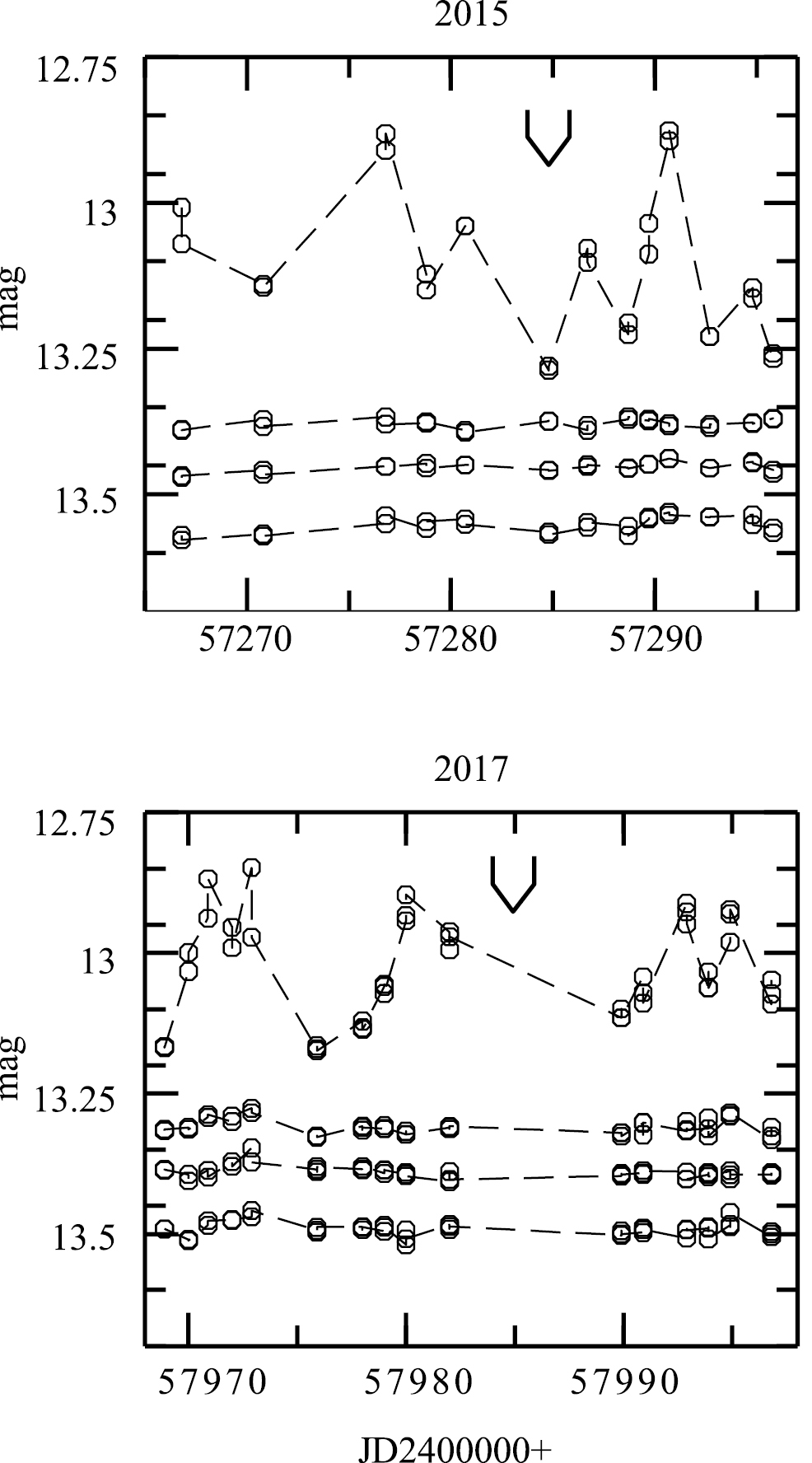 После проведения фотометрической калибровки по звездам сравнения была определена звездная величина ядра галактики в соответствующих фильтрах как среднее из двух (иногда трех) ПЗС-кадров. Необходимо отметить, что оценка фотометрической ошибки, как разность среднего значения ядра галактики от значений в каждом фильтре двух кадров, зависит от скорости изменения яркости ядра. Временной интервал между циклом наблюдений в фильтрах UBVRI достигает несколько минут (время экспозиций в каждом фильтре плюс время считывания сигнала), в который может измениться яркость галактики. Более надежной оценкой фотометрических ошибок является разность между калибровкой по стандартным звездам. На рис. 1 приводятся кривые яркости в фильтре V ядра галактики в круглой апертуре диаметром 13.5 угл. сек и в том же масштабе разность значений между стандартными звездами с номерами (6–8), (6–1), (6–4) и произвольно сдвинутой по оси ординат. Стандартные звезды с указанными номерами использованы из списка Дорошенко и др. (2005). Верхняя часть рис. 1 относится к данным за сентябрь 2015 г. (ПЗС-камера SNUCAM), нижняя – за август 2017 г. (ПЗС-камера FLI MicroLine). Статистический анализ изменений разности калибровок по стандартным звездам (6–8), (6–1), (6–4) показал стандартное отклонение в звездных величинах 0.0136, 0.0092, 0.0138 для кривых на рис.1 (2015) и 0.0104, 0.0125, 0.0139 (2017). Фотометрические ошибки имеют значения 0.01 звездной величины, исключая очень редкие отклонения до 0.04 зв. вел. Изменения яркости ядра галактики на порядок больше, чем фотометрические ошибки. Отметим, что калибровка по нескольким звездам не приводит к увеличению точности измерения по сравнению с калибровкой по одной звезде, но дает уверенность в реалистической картине измеряемых значений яркости центральной части SyG NGC 7469.