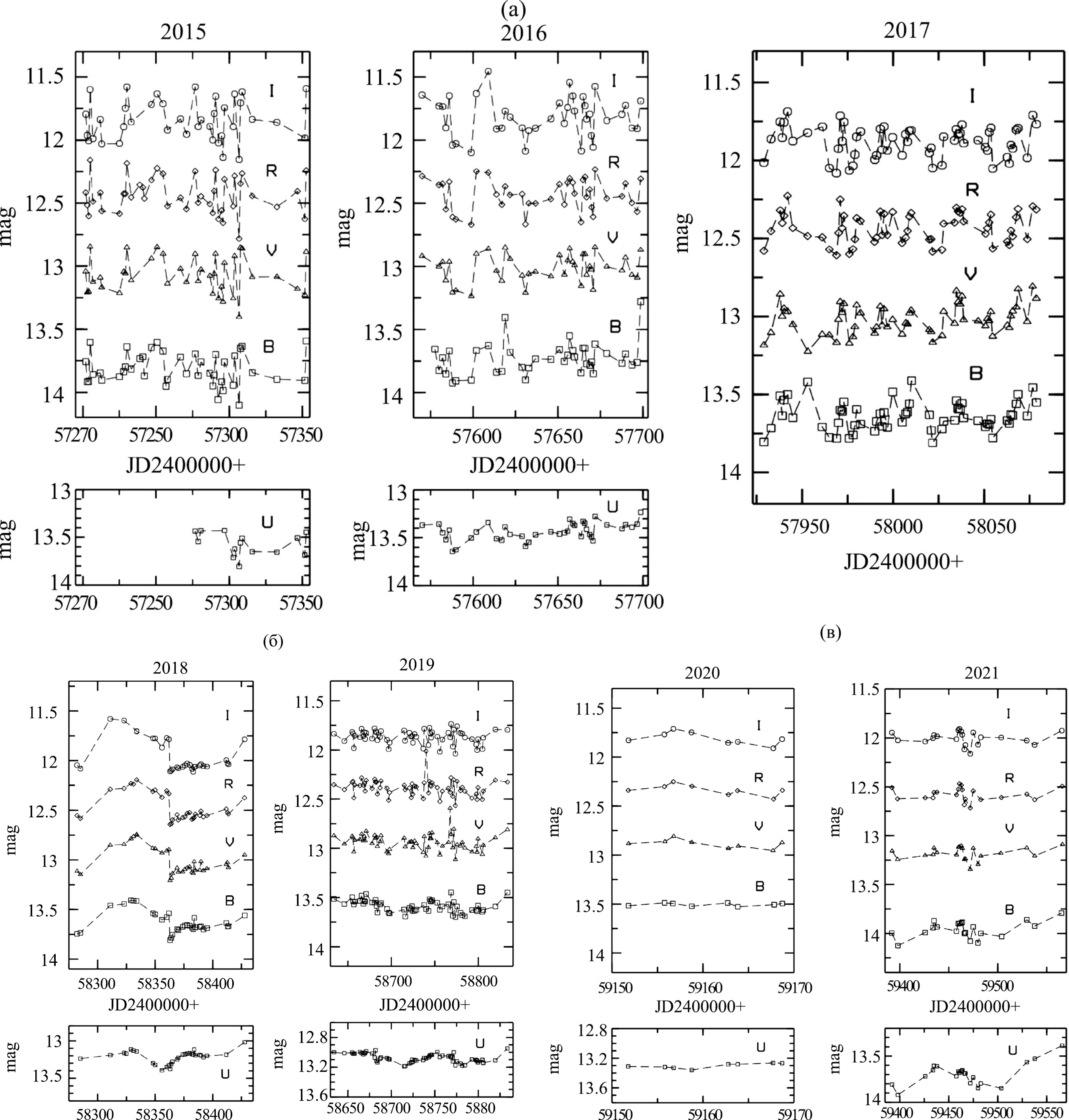 Результаты наблюдений представлены в графическом виде на рис. 2а–в в окнах видности как кривые переменности в фильтрах UBVRI в круглой апертуре диаметром 13.5 угл. сек. На оси ординат “mag” шкала в звездных величинах, диапазон 2.5 зв. вел. достаточен для описания значений BVRI яркости для всего периода наблюдений. Для удобства значения U яркости выделены в отдельном блоке на рисунках. На представленных кривых яркости не учтено галактическое поглощение, так как мы считаем, что значения поглощения получаются с некоторыми элементами моделирования, и важнее показать оригинальные наблюдаемые значения яркости NGC 7469. Можно визуально добавить поправку за поглощение на кривых яркости на рисунках. Поправки за галактическое поглощение в звездных величинах представлены в двух источниках: AU = 0.282, AB = 0.250, AV = 0.184, AR = 0.146, AI = 0.104 (S и F) в работе Шлафли и др. (2011) и AU = 0.342, AB = 0.297, AV = 0.223, AR = 0.181, AI = 0.135 (SFD) в Шлегель и др. (1998).