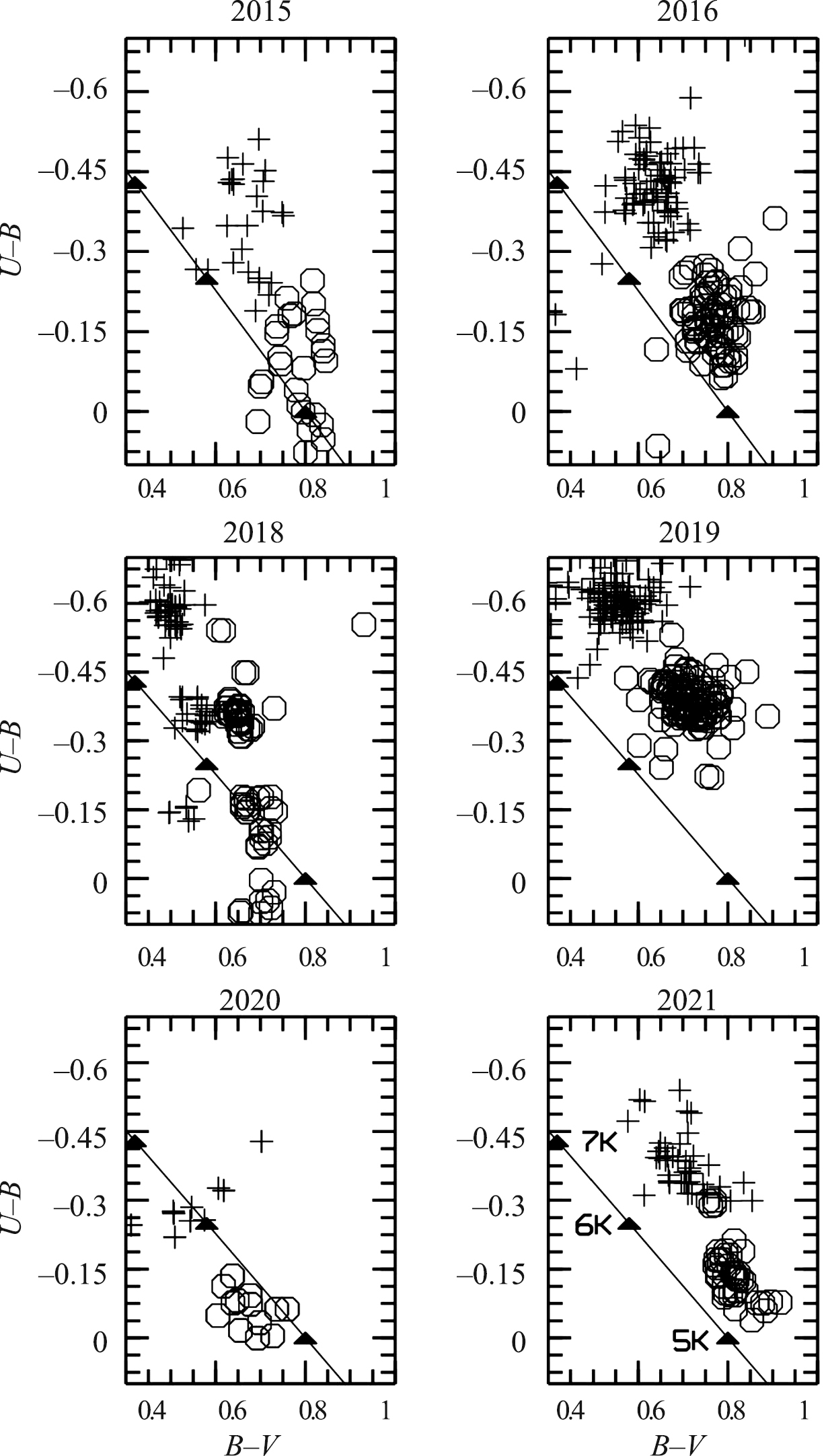 Рис. 4. Двухцветные диаграммы (U–B) – (B–V). На диаграмме показаны данные показателей цвета без учета галактического поглощения. Символ + использован для показателей цвета в круглой апертуре размером 5 угл. сек, кружком для 30 угл. сек.