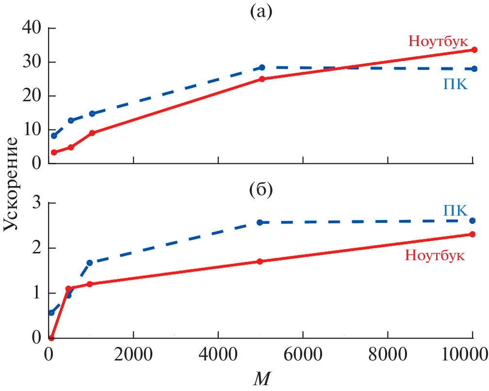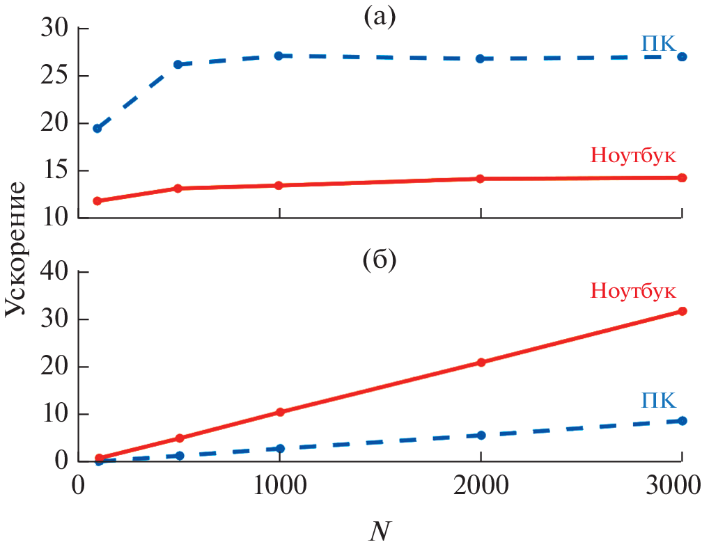 Рассмотрена задача ускорения алгоритма расчета нелинейных эффектов при моделировании высокоинтенсивных ультразвуковых пучков на основе однонаправленного уравнения Вестервельта. При построении численного решения для сильно искаженных волн с ударными фронтами необходимо учитывать большое число гармоник (до 1000) на пространственных сетках с размером матриц порядка 10 000 на 10 000, что требует обработки больших объемов данных и длительного времени расчетов. В данной работе реализация оператора нелинейности проводится во временном представлении с использованием удароулавливающей схемы типа Годунова, которая позволяет моделировать нелинейные волны с ударными фронтами с небольшим (3) количеством узлов сетки на ударном фронте. В работе проводится сравнение эффективности использования данного метода при его реализации на центральном процессоре (CPU) и графических ускорителях (GPU) по сравнению со спектральным методом, реализованным ранее для квазилинейного распространения волны. Проводится анализ скорости выполнения алгоритмов на CPU и GPU в зависимости от размеров массивов входных данных.