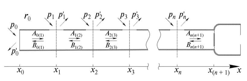 Рассмотрим интерференционную антенну длиной L с n боковыми отверстиями. Слева антенна открыта, а справа закрыта мембраной микрофона. Боковые отверстия пронумеруем слева направо – ближайшее отверстие к открытому торцу будет иметь номер i = 1, а ближайшее к концу, закрытому мембраной микрофона, i = n. Пусть центрам боковых отверстий соответствуют координаты x1, …, xi, …, xn. Открытый торец антенны мы обозначим i = 0, он расположен в x0, а закрытый торец – i = = (n + 1), он расположен в x(n+1). Внутренний радиус антенны обозначим r0, а толщину стенки антенны – ∆. Каждое боковое отверстие имеет радиус ri, а центры отверстий находятся на расстоянии d друг от друга. Открытый торец и боковое отверстие находятся на расстоянии d друг от друга, так же, как и боковое отверстие i = n от мембраны микрофона. На рис. 1 показано модельное представление интерференционной антенны. Требуется получить аналитическую запись результирующего звукового поля внутри интерференционной антенны на поршневой (нулевой) моде.