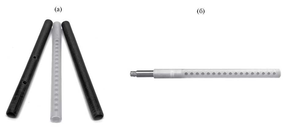Были подготовлены три образца: образец цилиндрической трубки без боковых отверстий и образец двух интерференционных антенн. Продольные и поперечные разрезы образцов показаны на рис. 2, а вид – на рис. 3. Образцы напечатаны на 3D-принтере из фотополимера (белый) и стеклонаполненного акрилонитрил бутадиен стирола (черные).