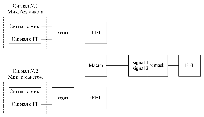 С помощью DAQ системы синхронно были записаны сигналы с микрофона и сигналы с клемм излучателя. Последующая обработка сигналов проводилась в Matlab. Схема обработки сигналов показана на рис. 6. Записанные сигналы обрезались по времени таким образом, чтобы длительность записи соответствовала распространению звуковой волны на расстояние 10 м.