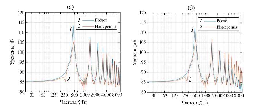 Рис. 8. Результаты расчета уровня звукового давления на мембране ненаправленного капсюля для интерференционных антенн с количеством отверстий (а) – n = 2 и (б) – n = 17 при фронтальном падении звуковой волны в сравнении с результатами измерений.