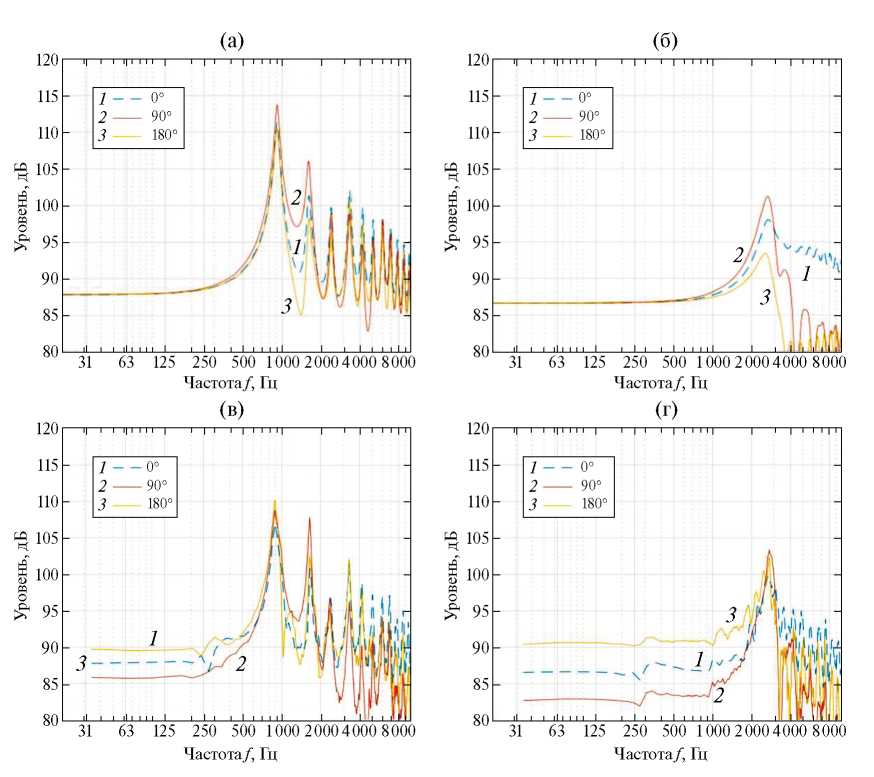 На рис. 9 представлены результаты расчета (а, в) и результаты измерения (б, г) уровня звукового давления на мембране ненаправленного капсюля для интерференционных антенн с количеством отверстий (а, б) n = 2 и (в, г) n = 17 при фронтальном (θ = 0°), боковом (θ = 90°) и тыловом (θ = 180°) падении звуковой волны. Для n = 2 наблюдается хорошее совпадение формы кривых для расчетов и измерений при всех углах падения звуковой волны. Для n = 17 совпадение носит более качественный характер. Для обоих образцов измеренный уровень звукового давления при тыловом падении волны на 2.5 дБ выше расчетного, а на частотах ниже первого резонанса превышает кривую для фронтального падения звуковой волны (эта особенность отмечалась в работе [21]).