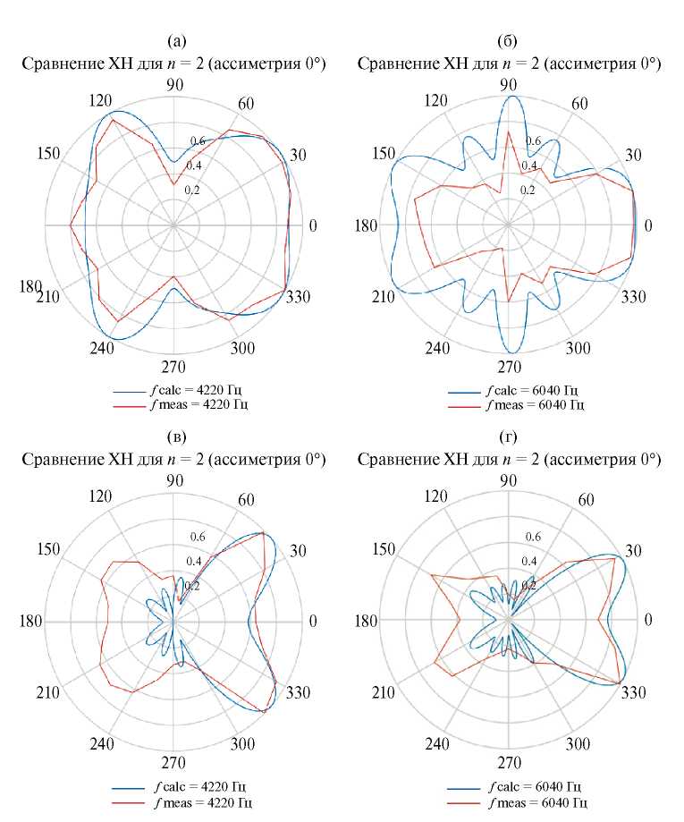 Рис. 10. Результаты расчета характеристики направленности интерференционных антенн с количеством отверстий (а, б) – n = 2 и (в, г) – n = 17 с ненаправленным микрофонным капсюлем в сравнении с результатами измерений на частотах 4220 и 6040 Гц.