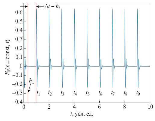 Здесь финитная функция f(x) с носителем S описывает пространственную локализацию источника, а функция g(t) определяет его временной профиль. Предполагается, что g(t) финитна и “быстро убывает” на своем носителе [0, ht], 2ht << Δt. Таким образом, во временной области источник представляет собой последовательность коротких импульсов, следующих друг за другом с интервалами Δt – ht (Δt – ht >> ht). На этих временных интервалах происходит сбор и начало обработки информации. Пример характерной зависимости F0(x, t) при фиксированном x приведен на рис. 1.