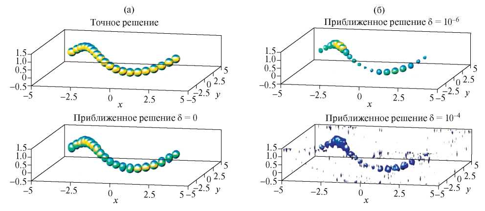 Рис. 4. (а) – Сравнение точного решения и приближенного решения для точных данных (δ = 0). (б) – Приближенные решения для возмущенных данных с δ = 10–6 и δ = 10–4.