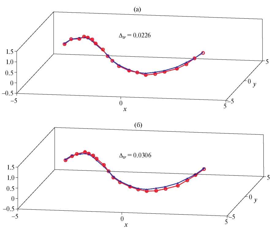 где η(t) – точная траектория, ηappr(t) – приближенно найденная траектория, а L(η) – длина точной траектории. Отметим, что даже в случае δ = 0 ошибка данных содержит часть, связанную с конечномерной аппроксимацией решаемой обратной задачи. Именно по этой причине величина Δtr оказывается не нулевой при δ = 0.