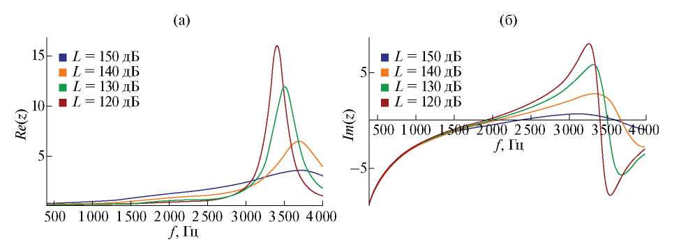 Рис. 2. Зависимости (а) – действительной и (б) – мнимой частей импеданса двухслойной сотовой ЗПК от частоты при различных уровнях звукового давления и отсутствии потока.