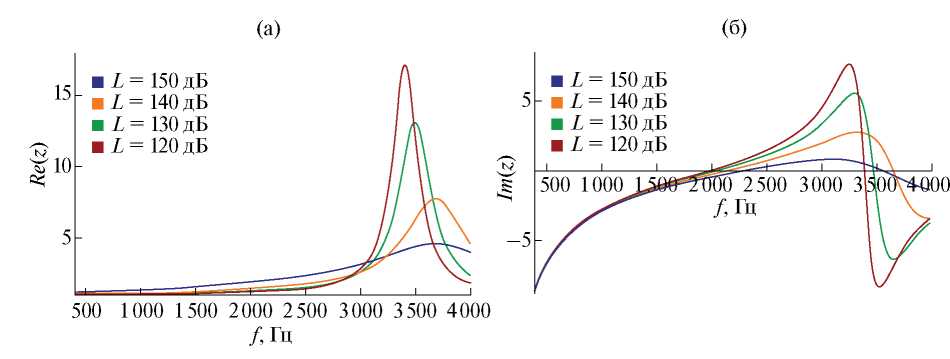 На рис. 2 и 3 представлены рассчитанные зависимости реальной и мнимой частей импеданса рассматриваемых ЗПК от частоты звука при различных уровнях звукового давления в случаях отсутствия и наличия скользящего потока с числом Маха M = 0.32 соответственно. Рисунки 2 и 3 показывают относительно сильную зависимость импеданса рассматриваемых ЗПК от уровня звукового давления, которая наиболее ярко выражена в окрестности частоты 3500 Гц.