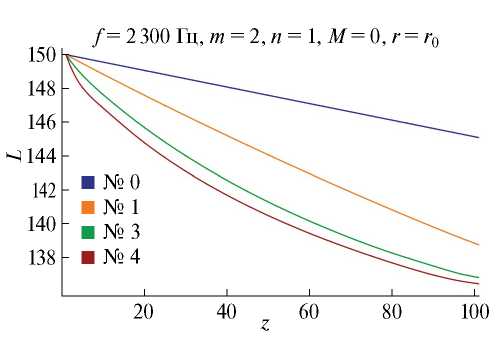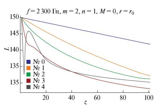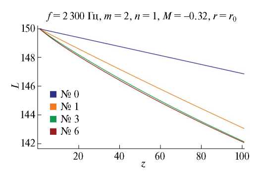 где ζm,n – n-й по порядку корень характеристического уравнения (8) с адмиттансом β0(L0). Данная мода будет иметь некоторое затухание при распространении по каналу, приводящее к снижинию уровня звукового давления в канале. Обозначим через L1(z) = 20lg(pm,n(z)/(2 × 10–5)) вычисленную согласно (9) зависимость уровня звукового давления от осевой координаты на стенках канала. Далее определим адмиттанс β1(L1(z)) вдоль оси канала и определим параметр ε: