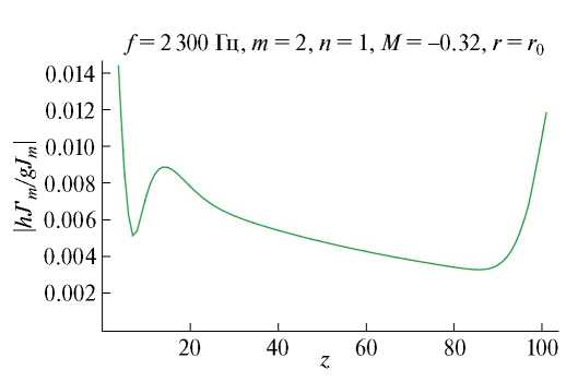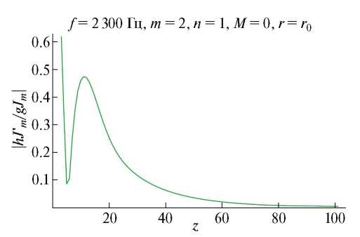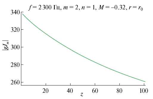 Рис. 7. Зависимость модуля амплитудной функции g(r, z)Jm(ψ(r, z)) от z, см, для моды с m = 2, n = 1 при частоте f = 2300 Гц и числе Маха потока в канале M = –0.32.