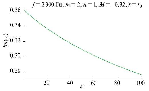 Рис. 6. Зависимость мнимой части волнового числа от z, см, для моды с m = 2, n = 1 при частоте f = 2300 Гц и числе Маха потока в канале M = –0.32.