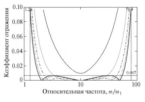 На рис. 1 приведены частотные зависимости модуля коэффициента отражения, рассчитанные по формуле (19) с учетом выражений (15)–(17), (22) для случая ω2/ω1 = 100 при разных значениях ζ и Bζ = 0.725. Варьированием параметра Bζ можно несколько расширять рабочий диапазон частот за счет уменьшения степени поглощения звука в нем и наоборот.
