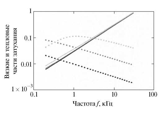 На рис. 2 приведены примеры частотных зависимостей вязких δvis(f) (26) и тепловых δT(f) (5) частей затухания для воздушных пузырьков трех размеров в вязкой жидкости с ηl = 0.5 Па с. Видно существенное превышение вязких потерь над тепловыми на высоких частотах. К сожалению, это не касается низких частот.