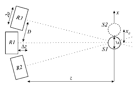 Рис. 1. Схема корреляционного приема теплового акустического излучения решеткой из трех датчиков R1, R2, R3; 1, 2, 3 – оси датчиков; S1, S2 – положения источника, 2a – диаметр датчика, D – расстояние между центрами датчиков, z – расстояние от приемников до источника, Δz – сдвиг приемника в направлении акустической оси системы, х – ось, вдоль которой перемещали источник, Δx – диаметр источника, x0 – сдвиг источника.