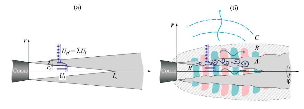 Рис. 1. Схематичное изображение (а) – среднего течения и (б) – структуры пульсаций, создаваемых турбулентной струей, истекающей из круглого сопла при наличии спутного потока.