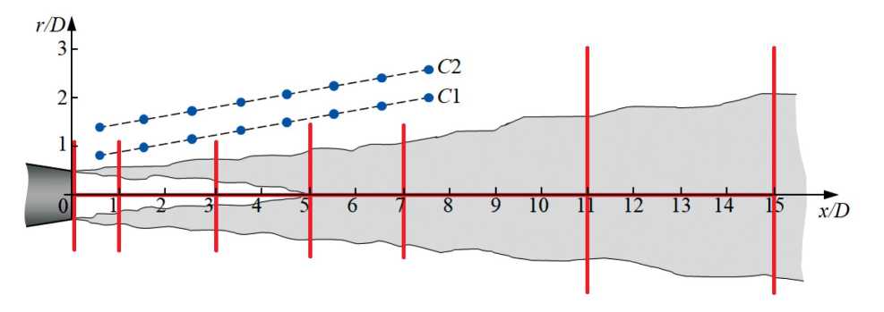 Измерения термоанемометром проводились вдоль оси струи с шагом Δx/D = 0.5, а также в поперечных сечениях с координатами x/D = 0.075, 1, 3, 5, 7, 11, 15 с шагом соответственно Δr/D = 0.025, 0.025, 0.025, 0.05, 0.05, 0.1, 0.1. Схема расположения линий измерения показана на рис. 2. Использовался датчик Dantec 55P01, частота дискретизации составляла 80 кГц. Нить термоанемометра располагалась перпендикулярно основному потоку и регистрировала преимущественно продольную компоненту скорости, которую можно представить в виде осредненного по времени значения и пульсаций U = Ua + u. Более подробное описание точек измерения и методов обработки данных приведено в работах [13, 17, 34].