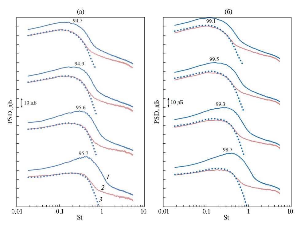В заключение отметим, что спектры шума взаимодействия (а значит, и ближнего поля пульсаций давления), полученные в настоящей работе, оказываются более точными на низких частотах, чем в работе [36], в которой оценка пульсаций давления выполнялась на основе измерений пульсаций на оси струи с последующим их пересчетом в заданную точку с помощью решения параболизованных уравнений устойчивости. Возможность прямого измерения пульсаций скорости вне струи при наличии спутного потока, а также более корректная оценка скорости их конвекции на основе данных эксперимента избавляют от необходимости использования решения задачи устойчивости, которое не вполне пригодно именно в низкочастотной области (когда размер волнового пакета становится больше длины начального участка).