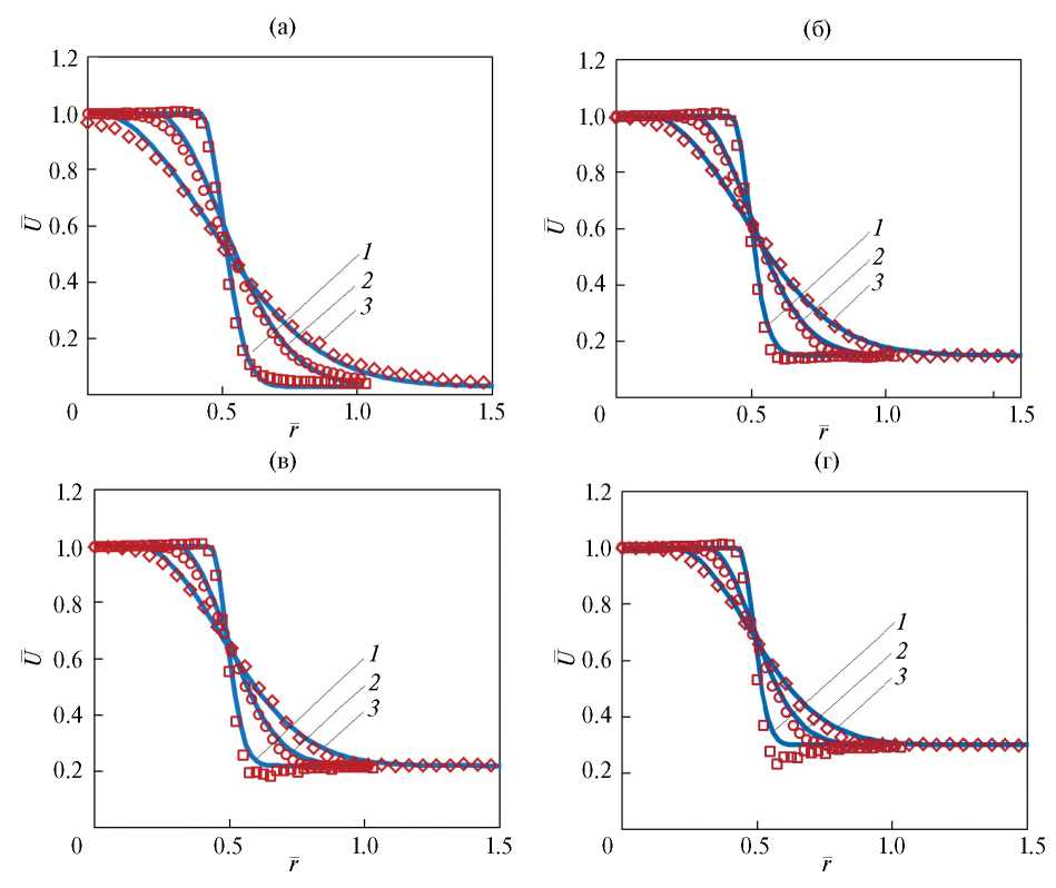 Рис. 5. Поперечные профили средней скорости для струи Mj = 0.4 с различным параметром спутности: (а) – =0; (б) – 0.15; (в) – 0.23; (г) – 0.3. Символы – эксперимент, линии – модель (11)–(13). Показаны профили для трех сечений начального участка: 1 – = 1; 2 – = 3; 3 – = 5.