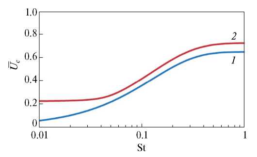 Выражения (14) и (15) решают задачу пересчета функции U'c(St'), полученной для струи в статических условиях (l = 0), в функцию Uc(St) для струи в спутном потоке с заданным значением l. С точки зрения применимости к реальной струе данная процедура носит, конечно, приближенный характер и справедлива в той мере, в которой “работает” локально-однородное приближение.