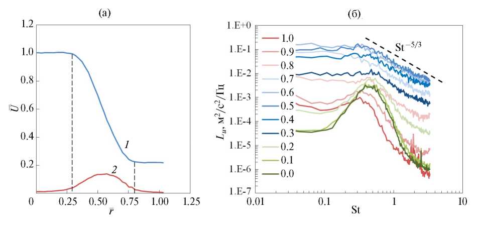 На рис. 9а показаны профили безразмерных средней скорости и среднеквадратичных значений пульсаций ее продольной компоненты, измеренные с помощью термоанемометра в сечении x = 3, а на рис. 9б – спектральные плотности пульсаций продольной компоненты скорости в данном сечении при различных значениях r (для удобства показаны спектры для каждой четвертой точки). Штриховыми линиями на рис. 9а показаны примерные границы слоя смешения, внутри которого наблюдаются наиболее интенсивные пульсации, связанные с вихревым турбулентным течением в данной области. В потенциальной части течения пульсации скорости хотя и существенно ниже, чем в слое смешения, но не равны нулю, что хорошо видно на рис. 9б, где приведены их спектры.