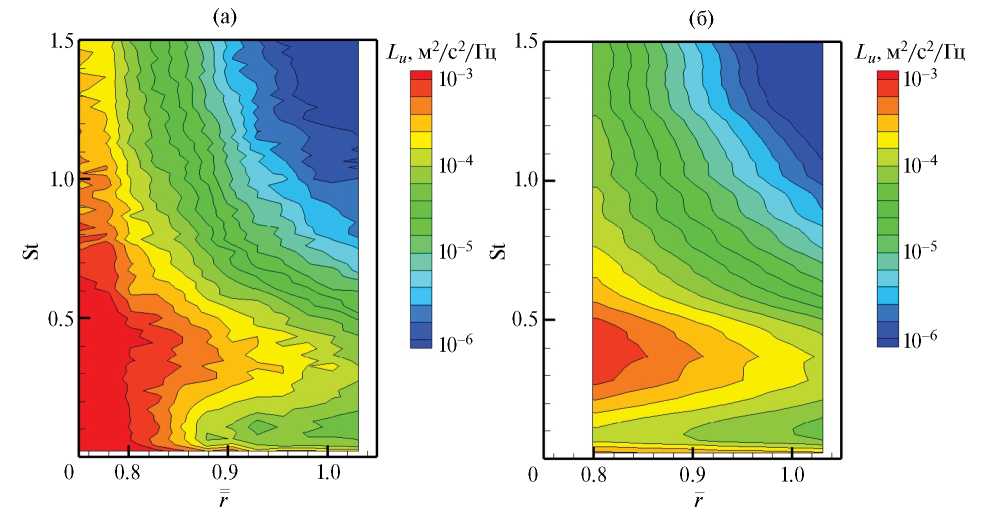 Как видно, внутри потенциального ядра (r < 0.25) модель хорошо соответствует данным измерений. Аналогично, на рис. 11а показана спектральная карта пульсаций вне струи, а на рис. 11б – спектральная карта, построенная на основе спектра Lu в точке r = 1 с использованием модельной зависимости (18) в виде Lu(St, r) ≈ ≈ Lu(St, 1)|K0(bcfrD)|2. Модель хорошо соответствует данным измерений для внешней зоны ближнего поля (r > 0.8). Таким образом, предложенная полуэмпирическая модель позволяет адекватно воспроизвести пространственно-частотную структуру пульсаций скорости в потенциальной зоне ближнего поля как внутри, так и вне струи, что, в свою очередь, обосновывает возможность использования выражений (6), (7), (16) для оценки пульсаций давления в соответствующих областях.