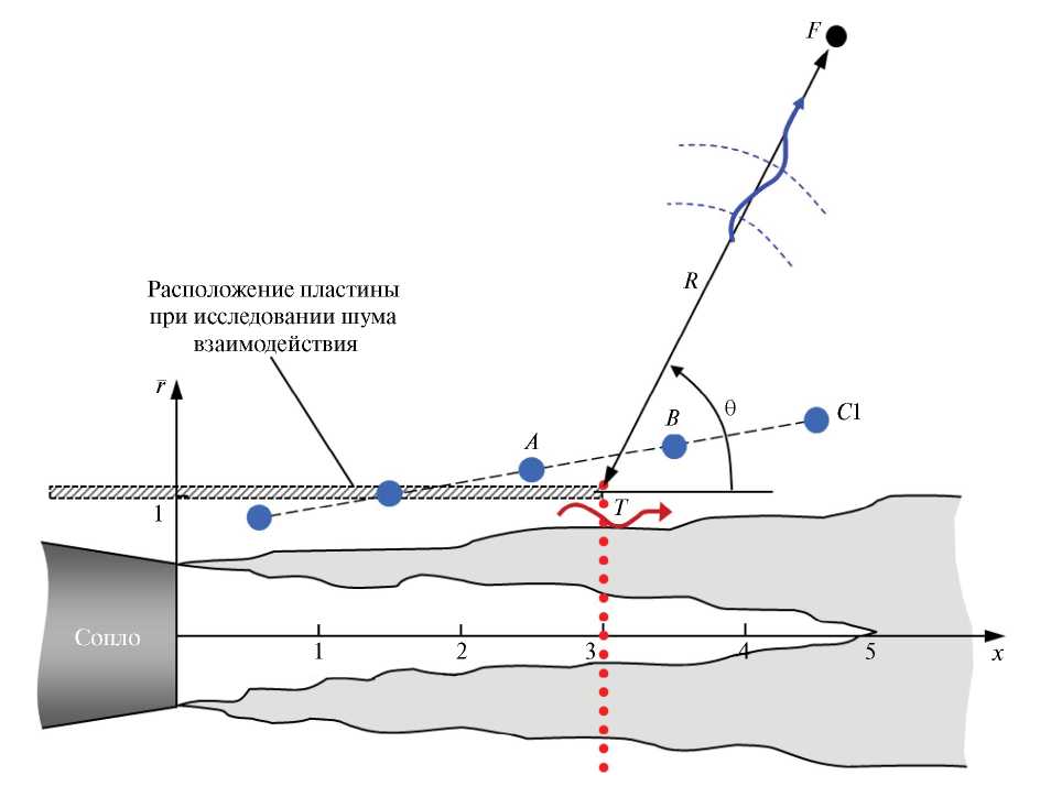 К настоящему времени пока не разработана полная динамическая модель турбулентной струи как объекта механики жидкости, в частности, отсутствует единая точка зрения на природу генерации шума таким течением [5–10]. В отношении пульсаций ближнего поля струи ситуация более понятна. Считается, что для области максимума спектра они главным образом связаны с развитием в слое смешения струи когерентных структур, возникающих за счет неустойчивости Кельвина–Гельмгольца и имеющих вид волновых пакетов с различными азимутальными числами [10–13]. Именно возмущения такого типа определяют максимальные уровни пульсаций в ближнем гидродинамическом поле струи (вне слоя смешения) и ответственны за мощный дополнительный источник шума, связанный с их рассеянием на задней кромке крыла в случае его близкого расположения к соплу, как это часто имеет место для современных самолетов [3, 14–17]. В работах [13, 18, 19] изучалась возможность активного управления волнами неустойчивости с целью снижения их интенсивности в ближнем поле и соответствующего ослабления шума взаимодействия струи и крыла в случае его расположении вблизи струи [20, 21]. Кроме того, в высокоскоростных струях волны неустойчивости могут сами стать заметными источниками звука даже в отсутствие близкорасположенных рассеивающих поверхностей [7, 9, 10].