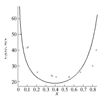 Рис. 4. Зависимость (19) (сплошная линия) и экспериментальные точки, взятые из работы [12] (кружочки). По оси ординат отложена скорость звука cs, а по оси абсцисс – концентрация.