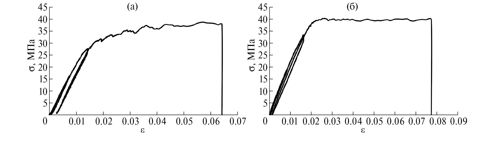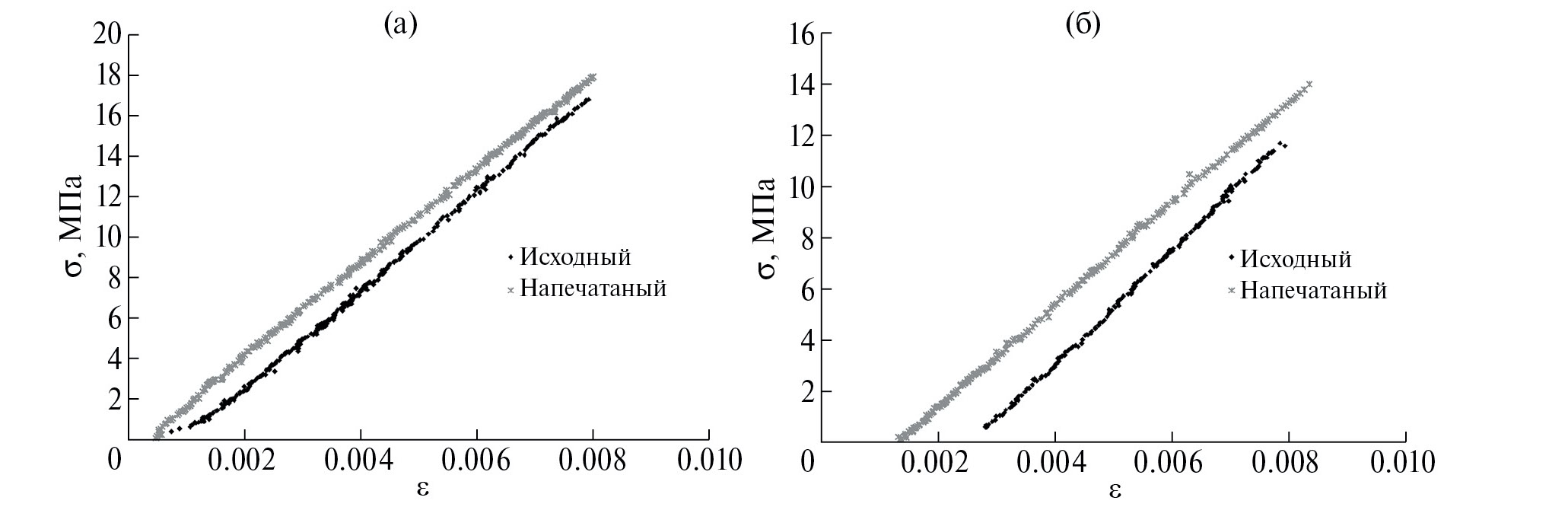 Рис. 1. Экспериментально измеренная нагрузочная кривая σ(ε) для (а) – исходного и (б) – 3D-напечатанного образцов ABS