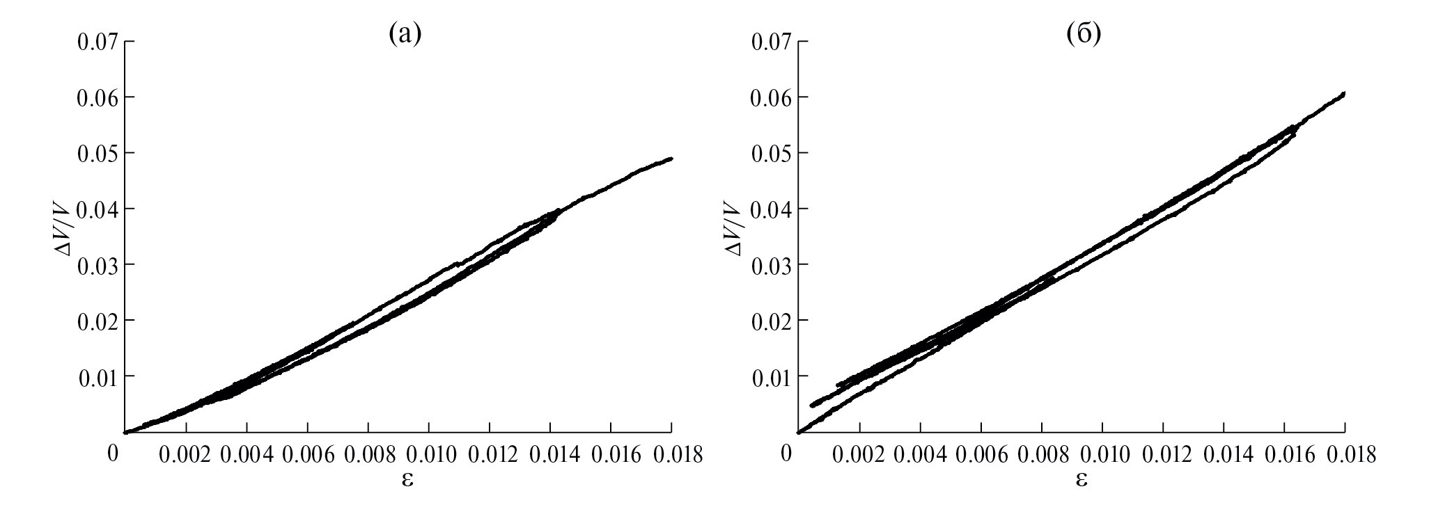 На рис. 1 приведены графики экспериментально измеренных зависимостей напряжение-деформация σ = σ(ε) для двух с половиной циклов изменения приложенного механического напряжения: (а) – для исходного и (б) – 3D-напечатанного образцов. При проведении эксперимента в каждом цикле нагрузки-разгрузки наблюдались небольшие гистерезисные зависимости σ(ε). При этом для каждого цикла нагрузки-разгрузки остаточная деформация для 3D-напечатанного образца была меньше, чем для исходного: после первого цикла остаточные деформации составляли ε ~ 0.0007 ± 0.0005 для исходного образца и ε ~ 0.0005 ± 0.0005 для напечатанного, после второго – ε ~ 0.0028 ± 0.0005 для исходного образца и ε ~ 0.0014 ± 0.0005 для напечатанного.