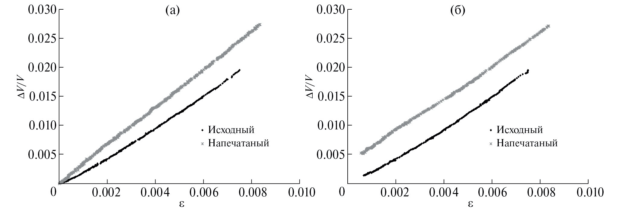 Рис. 3. Экспериментально измеренные зависимости относительного изменения скорости продольной волны от статической деформации для (а) – исходного и (б) – 3D-напечатанного образцов ABS