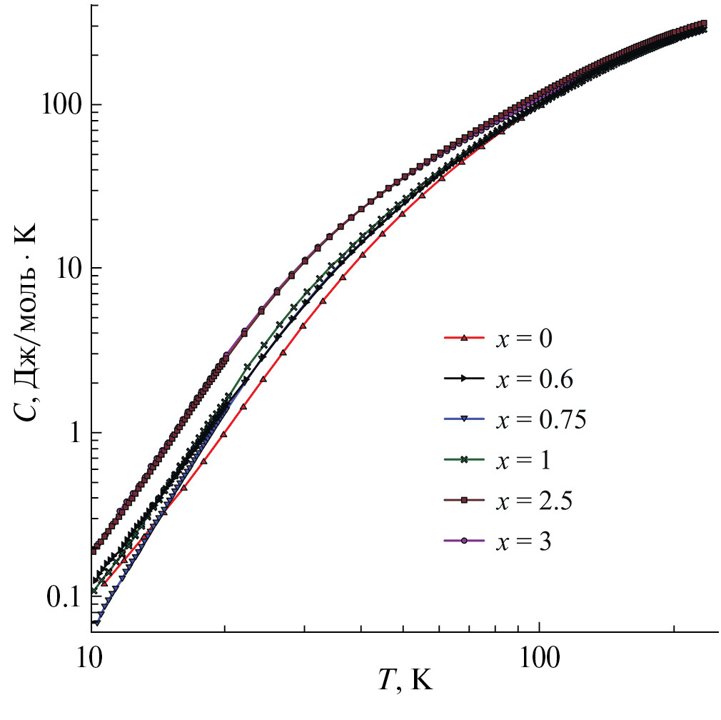 В связи с тем, что при образовании твердых растворов замещения существенно изменяется фононный спектр, целесообразно рассмотреть свойства монокристаллов Y3–xLuxAl5O12, которые могут отражать эти изменения. Одним из таких свойств является теплоемкость. Отсутствие парамагнитных ионов в решетке Y3–xLuxAl5O12 позволяет исследовать характер трансформации фононного спектра методом теплоемкости в широком диапазоне температур без учета влияния аномалий Шоттки, индуцируемых остальными редкоземельными ионами [22].