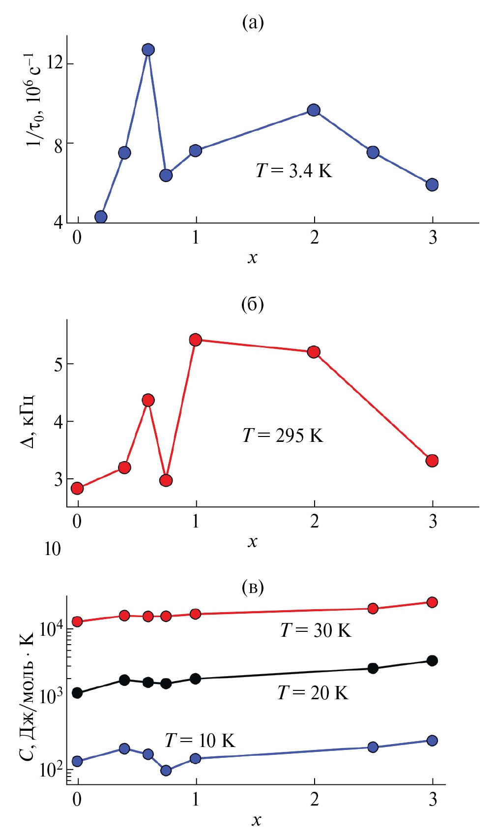 Однако при более низких температурах минимальную теплоемкость демонстрирует твердый раствор с x = 0.75. Такое поведение коррелирует с результатами исследований кристаллов Y3–хLuхAl5O12 акустическими методами, методом тепловых импульсов и ЯМР [19, 20]. На рис. 2 данные, полученные в этих работах, сопоставлены с данными по теплоемкости из настоящей работы. Видно, что для кристалла с x = 0.75 наблюдаются аномальное понижение упругого рассеяния тепловых фононов, сужение линии ЯМР 27Al и понижение теплоемкости на фоне концентрационных зависимостей этих величин.