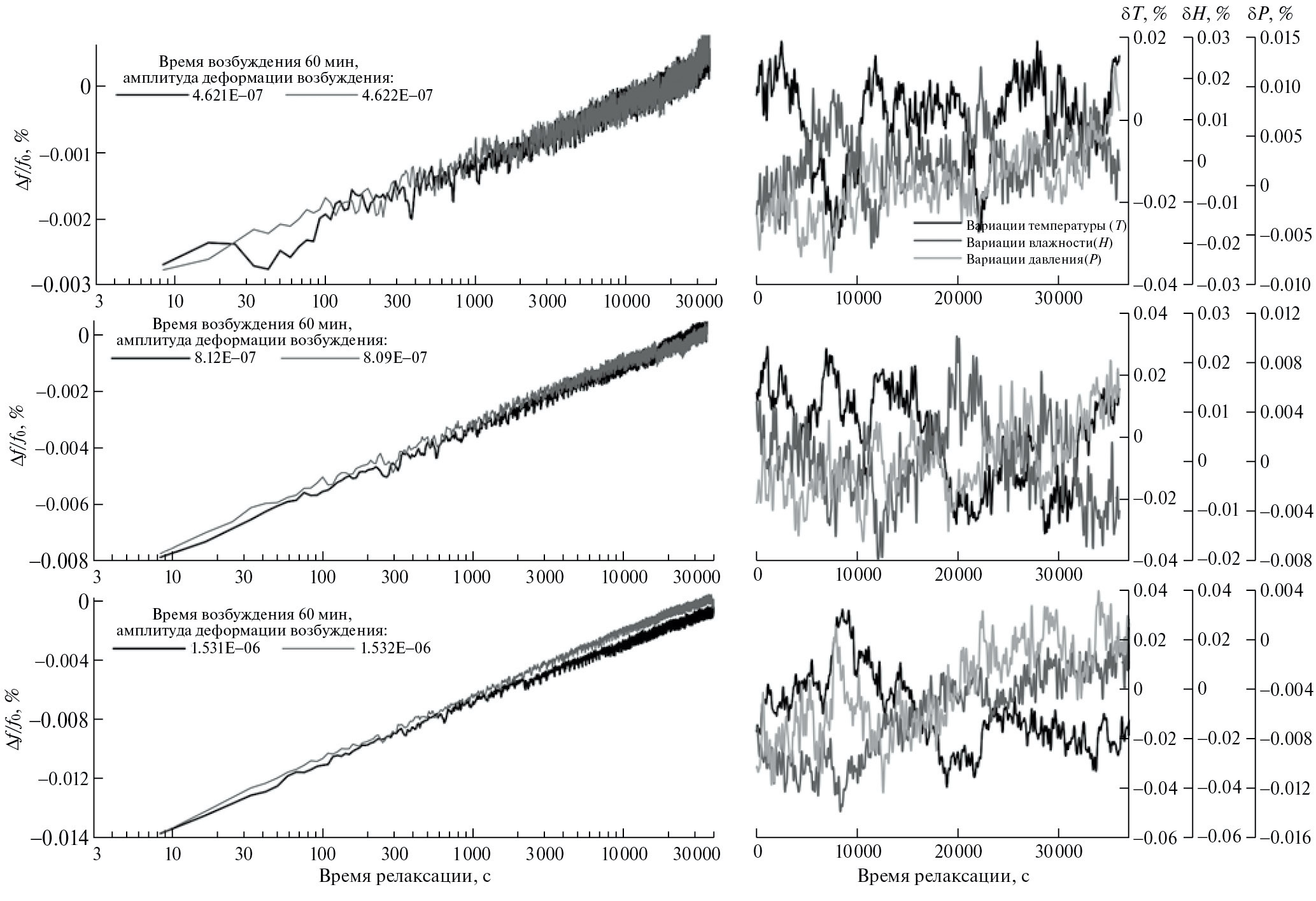 Прежде всего, следует остановиться на вопросе воспроизводимости данных и оценке возможного влияния на них вариаций термодинамических условий проведения измерений. Результат проверки воспроизводимости данных представлен на рис. 2. Здесь в левых частях графиков показаны кривые релаксации резонансной частоты продольной моды образца, невозмущенное значение которой составляло f0 ≈ 22 кГц (см. также в статье [17]). Использованный логарифмический масштаб по оси времени позволяет отчетливо видеть логарифмическую зависимость относительного возмущения резонансной частоты от времени. Амплитуды деформаций в процессе возбуждения показаны на графиках. При наблюдении релаксации использовалась амплитуда деформации в пробной волне ε = 6 × 10–9 для всех представленных на рис. 2 данных. В правой части графиков на рис. 2 показаны относительные изменения температуры, влажности и давления внутри объема герметичной камеры в процессе измерений. Сравнение правой и левой частей графиков явно указывает на отсутствие связи между наблюдаемой медленной релаксацией с логарифмической зависимостью от времени с вариациями термодинамических параметров, отвечающих условиям проведения измерений. Малые возмущения из-за изменяющихся термодинамических параметров можно отнести на счет шумовой дорожки в акустических данных, которая наиболее заметна для малой амплитуды возбуждения (рис. 2).