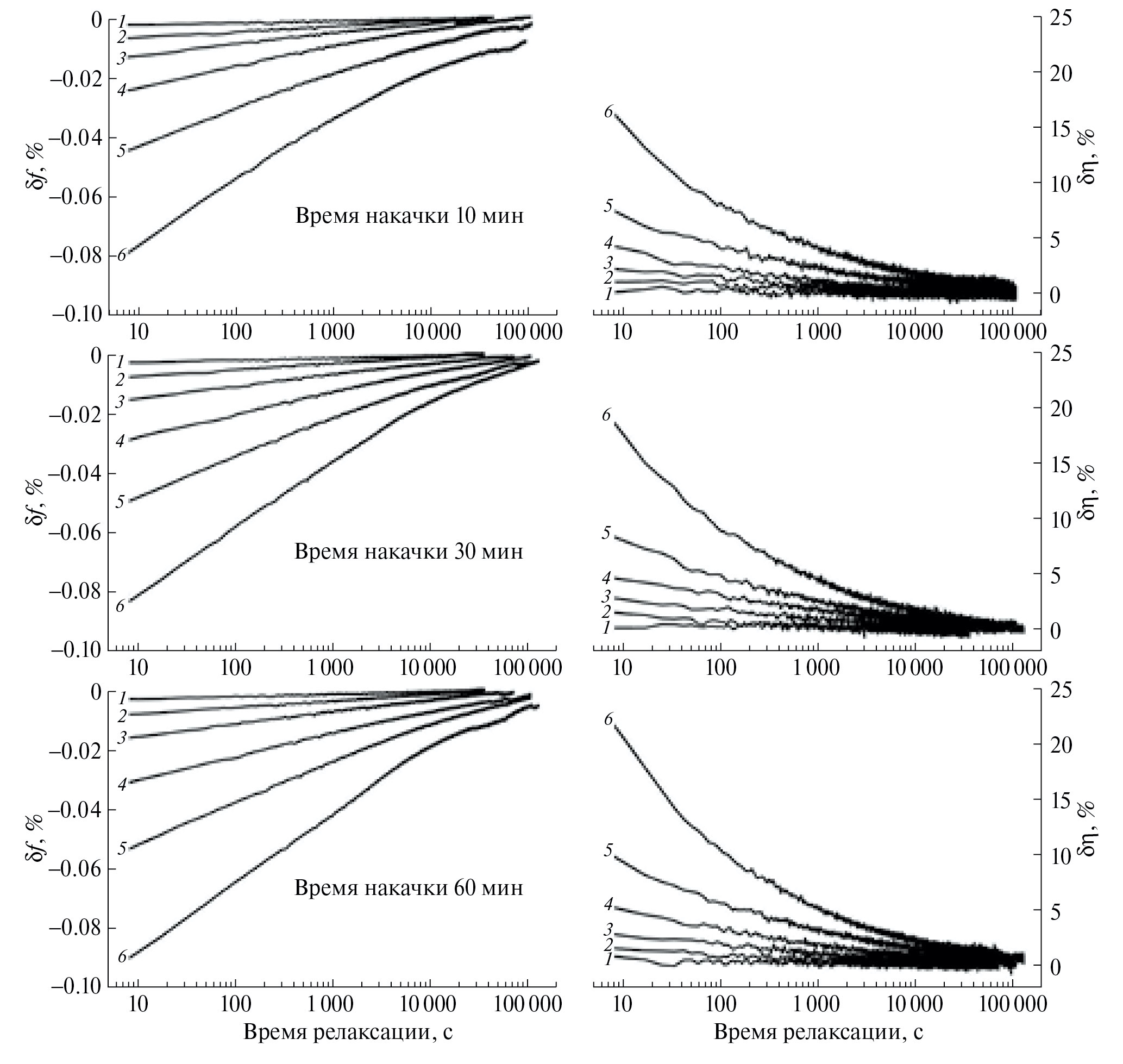 На всех левых и правых графиках рис. 3 сохранен одинаковый масштаб по осям ординат. Хорошо видно, что увеличение времени возбуждения приводит к увеличению начальных значений возмущений |δf(0)| и δη(0), и зависимость этих величин от времени накачки явно нелинейная. Явно видна также зависимость от амплитуды накачки. Длительность релаксации или время, при котором значения частоты и коэффициента потерь возвращаются в невозмущенные состояния, не обнаруживает явно выраженной зависимости от времени накачки для данных на рис. 3. Как следует из графиков, представленных далее, эта зависимость обнаруживается при расширении интервала времен возбуждения.