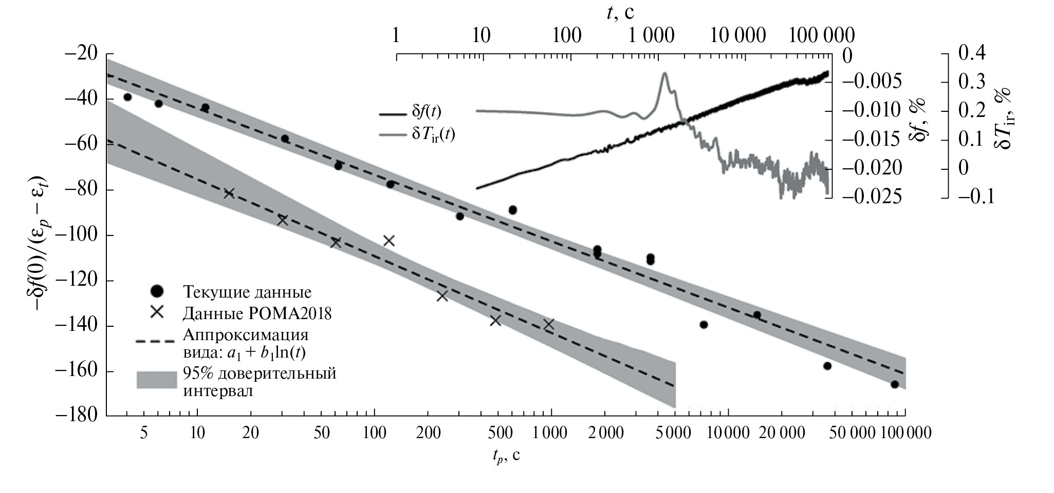 В правой верхней части рис. 6 показана кривая релаксации δf(t) для максимального времени возбуждения в серии измерений (tp = 24 ч) и вариации температуры δTir, измеренные датчиком IR (рис. 1б). Нетрудно видеть, что зависимость δf(t) не имеет каких-то особенностей, качественно отличающих ее от представленных на рис. 3. Зависимость вариаций температуры от времени не обнаруживает явно выделенных особенностей, которые можно было бы связать с логарифмической зависимостью от времени. Следовательно, наблюдаемая на рис. 6 логарифмическая зависимость δf(0) от времени возбуждения не связана с какими-то артефактами измерений. По техническим причинам дальнейшее увеличение времени возбуждения оказалось невозможным. Из общих физических соображений ясно, что бесконечный рост величины |δf(0)| с увеличением времени возбуждения невозможен. В противном случае это означало бы в конечном итоге разрушение материала малыми деформациями порядка 10–6, амплитуда которых примерно на два порядка меньше величин, отвечающих пределу прочности.