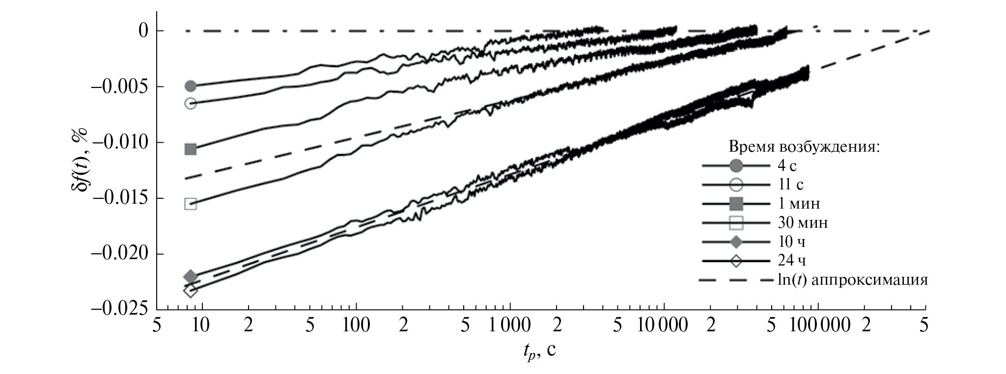 Интересно отметить еще одну особенность, ранее не наблюдавшуюся другими исследователями, – увеличение времени возбуждения приводит к росту времени релаксации, т.е. времени, необходимого для возврата в невозмущенное состояние δf = 0. На рис. 7 представлены кривые релаксации при существенно изменяющейся длительности возбуждения (см. пояснения на графике). Штриховыми линиями показаны логарифмические зависимости вида a + blnt. Из-за технических ограничений регистрация данных в течение времени более суток была невозможна. Поэтому об изменении времени релаксации при длительном возбуждении можно судить по экстраполяции соответствующих логарифмических зависимостей. Представленные на рис. 7 кривые релаксации указывают на вариации времени окончания релаксации от приблизительно 1 ч до 5 сут при изменении времени возбуждения от 4 с до 10–24 ч (кривые для 10- и 24-часового возбуждения почти не отличаются, что хорошо видно на графиках). Таким образом, при увеличении времени возбуждения растет по модулю не только начальное возмущение δf(0), что показано на рис. 6, но также растет и время, необходимое для возврата возбужденных состояний в невозмущенное состояние. Величина начального возмущения δf(0) для крайних значений времени возбуждения изменяется примерно в 5 раз, а изменение времени, необходимого для окончания процесса релаксации возмущения δf, для тех же крайних значений длительности возбуждения составляет примерно 120 раз. Поэтому мы можем заключить, что время возбуждения оказывает преимущественное влияние не на начальное возмущение резонансной частоты или скорости звука, а на длительность процесса релаксации. В разделе 4 обсуждается интересная, на взгляд авторов, гипотеза, связанная с обнаруженной зависимостью начального возмущения скорости звука и времени окончания процесса релаксации от времени возбуждения.