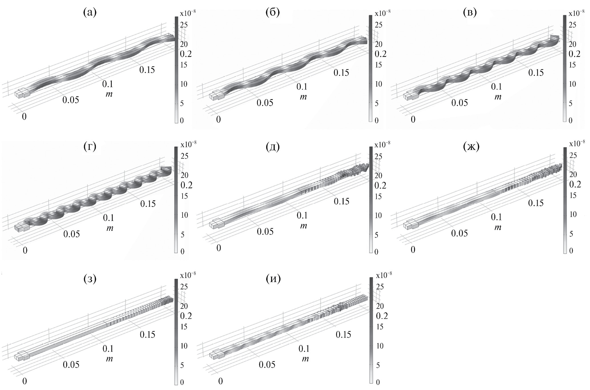 Рис. 3. Примеры форм изгибных колебаний стержней в горизонтальной проекции: в контрольном образце на частоте (а) — 12.8, (б) — 22.7, (в) — 54.6, (г) — 99.9 кГц; и в разрезном стержне на частоте: (д) — 10.4, (е) — 21.8, (ж) — 52.9, (з) — 99.5 кГц.