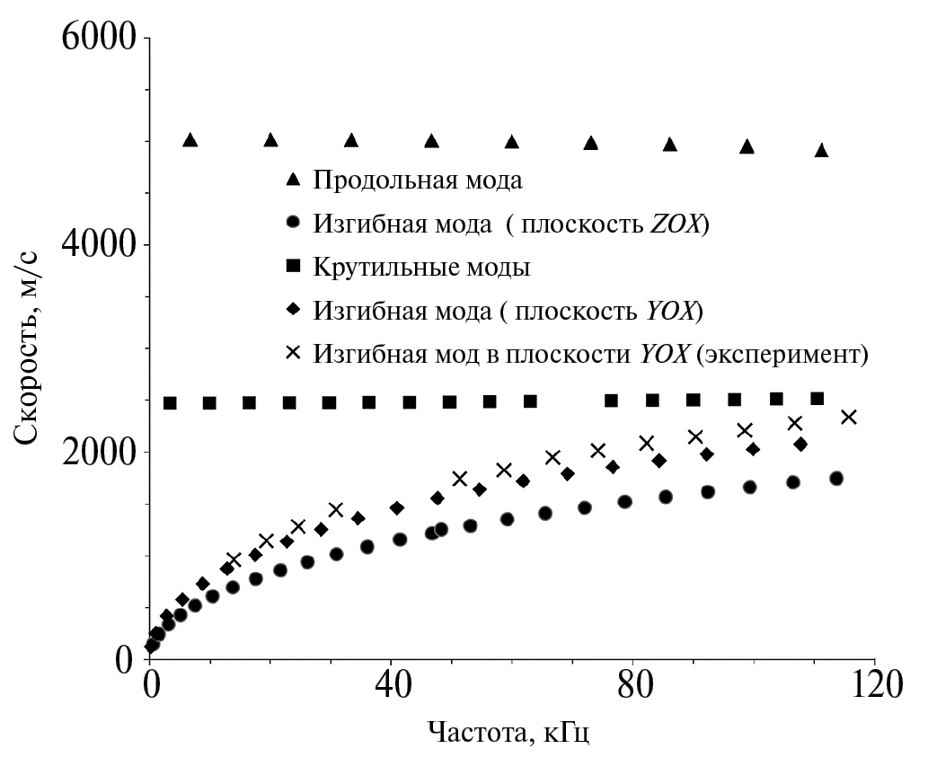 Рис. 4. Дисперсионные кривые стержня без разрезов (погрешность экспериментально полученных данных меньше величины маркера и увеличивается от 2% до 9% при уменьшении скорости).